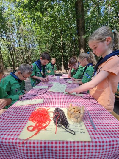 De middag stond in het teken van wat nodige ontspanning voor de welpen: dropveter-knopen oefenen, pasta-kettingen maken en een pizza-smaaktest.