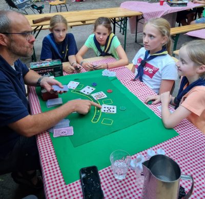 Don Pizzaroni eiste de eerste pizza van de welpen te proeven. Het werd de lekkerste pizza ooit. De Don keurde streng, rook aan de kruiden, proefde een punt pizza… en brak toen in een brede lach. “Bravissimo! Jullie hebben een pizza gemaakt zoals alleen mijn mama kan maken!” Het kamp barstte uit in gejuich. Don Pizzaroni was zó onder de indruk, dat hij ons uitnodigde om een avond door te brengen in zijn casino. Zo eindigde de avond met een bruisende casino-avond vol spellen en gezelligheid.